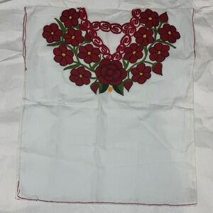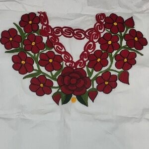 Red green, black and yellow, embroidered flowers along the neck