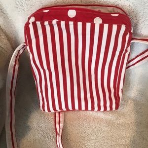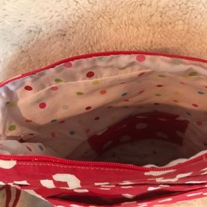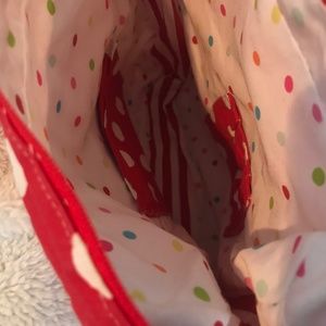 Very slight wear. Pockets galore. Outside pockets are length of the bag. 9”long, 5 1/2”wide