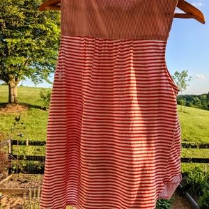 Really sweet Anthropologie striped summery top. Red and white, buttons up the front, sleeveless, biased cut detail around the bottom.