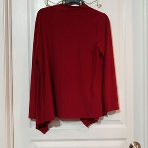 Long sleeve red blouse with an attached tan undershirt.
