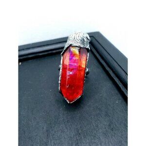 This one of a kind ring was crafted from a huge bright red rainbow angel aura quartz crystal. This crystal gemstone that gives off some nice inclusions depending on the lighting and angle.