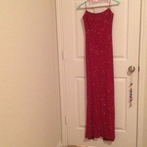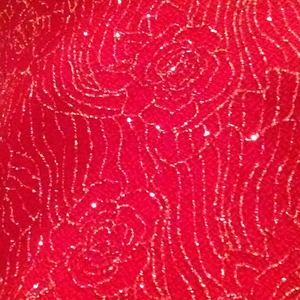 Gorgeous red gown covered in red glitter roses. Backless breathtaking fit, HAS been altered to fit less busty women better, however has never been worn-only due to cancelation of event-not due to choice. Wonderful for any formal event. Again, absolutely jaw dropping.