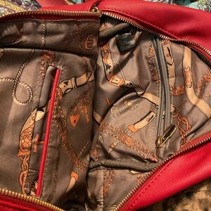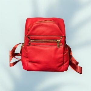 Small red backpack with adjustable straps, inside bag has a small pocket and zipper pocket. One zipper pocket on outside of bag and small pockets on each side of bag perfect for cell phone or keys.
