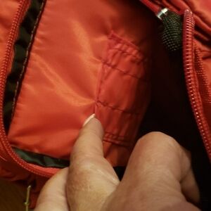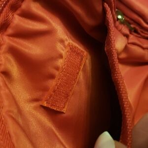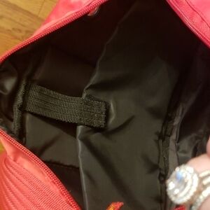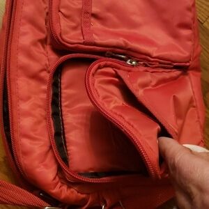 Red bag. Two front packets with velcro and two with zipper. Large pocket for a small laptop or iPad. No brand name listed but its a cute bag and you can add a scarf or twilly. No damage. Bag probably can be washed.