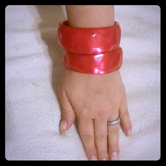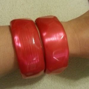 Never worn, plastic bangle bracelets,they are not flat they have soft curves.