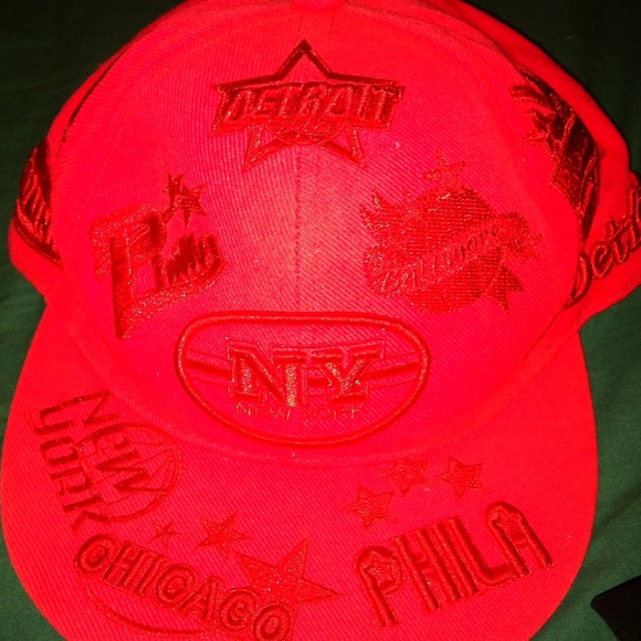 Red baseball hat with diff cities going around it