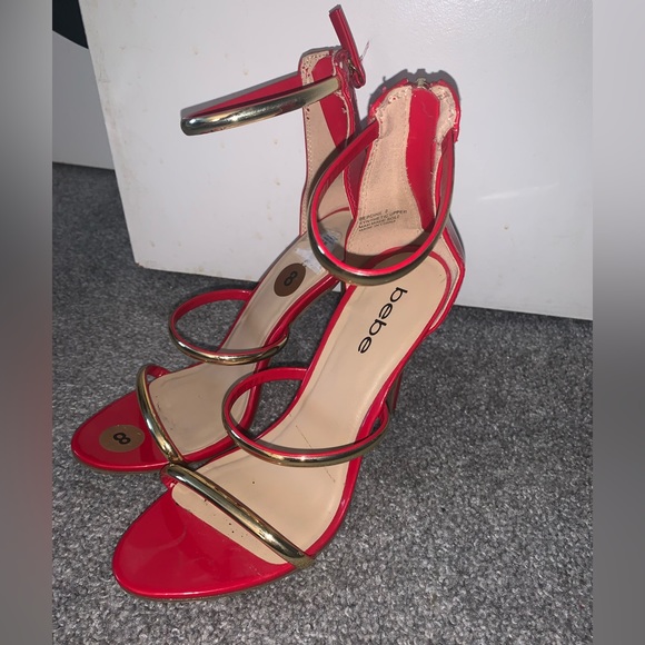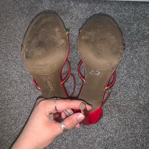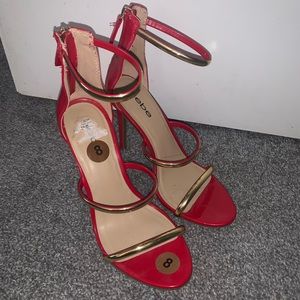 Red with gold detailed high heels, they have been worn, plenty love left in there shoes. Smoke free home with a cat.