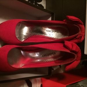 Red bebe heels with bow on the back. They say size 8 but they are more of a size 7.