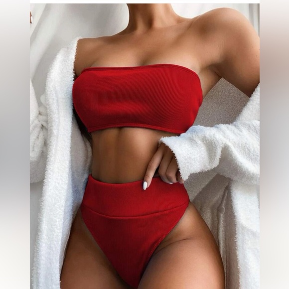 Small Bandeau ripped, high, waisted, red bikini