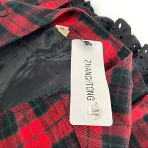Red and black plaid pleated wool blend mini skirt with black scalloped payer peaking out below