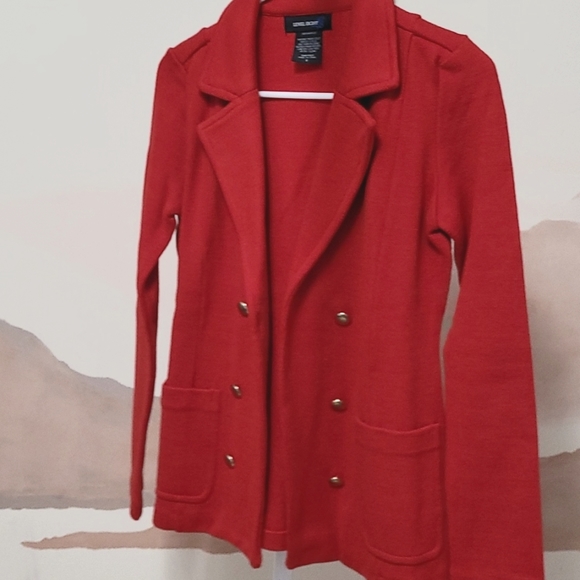 Well fitting women's acrylic blazer with gold buttons. Gently used but still gorgeous for a business or classy look.