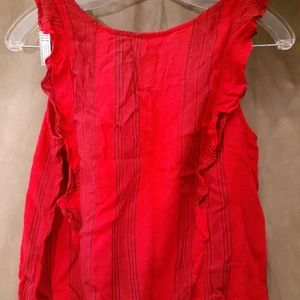 Sleevless red blouse with striped detailing and ruffles down the front and back with an