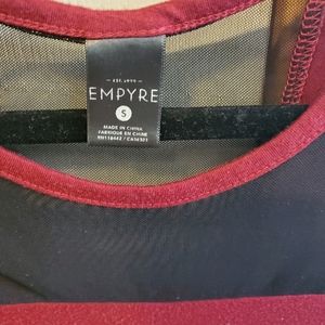 Red blouse, black mesh sheer around collar and down the back, 3/4 sleeve, size Medium