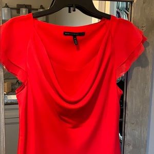 Simple, elegant red spring/summer blouse with ruffle cap sleeves. Scoop neck with material straight across for modesty. Great for work or casual look with Jean shorts.