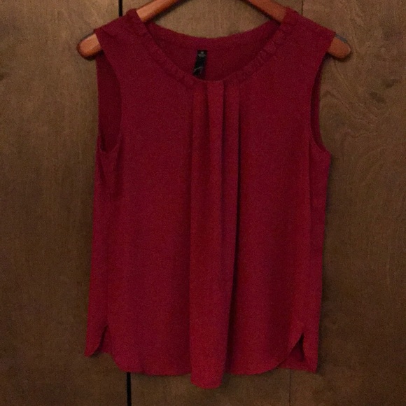 Carmine-red polyester blouse in good condition. It has no sleeves but wide tank-top straps with a high scoop neckline. There are nice pleats in the center that start at the neck. It is very loose-fitting on me. Bought in 2013, but lightly worn.