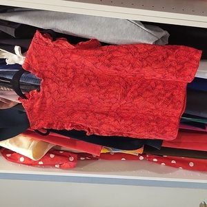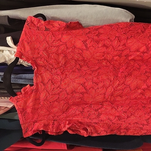 red lace blouse with soft inner lining, 50%cotton 40%poly 10% viscose. Perfect for jeans