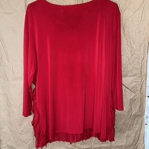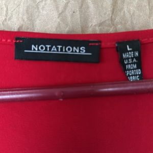 Notations brand, L, red, 97% polyester 3% spandex- back & sleeves 94% polyester 6% spandex- lining100% polyester. Ruffled front.