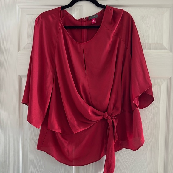 Vince Camuto red blouse. Tie detail in the front, 3/4 sleeves, zip and hook and eye closure in the back. Also has a small peek slit in front.