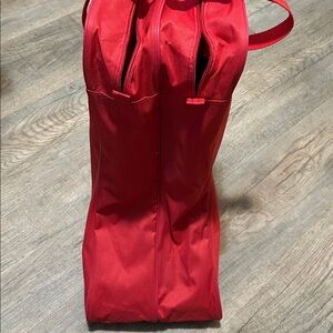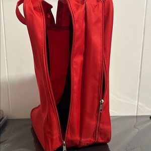 Stylish and durable red boot bag, protect those boots!!! Can fit 4 pairs of heels or canvas shoes as well as 1 pair of boots! Water resistant carryon approved!!!