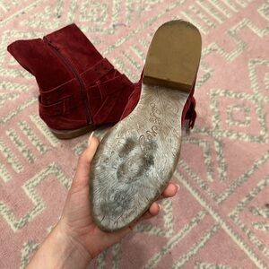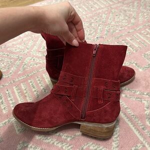 Worn once. Barely scuffed on the bottoms. Red suede with fringe detailing.