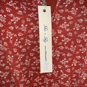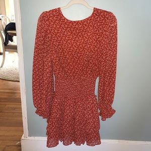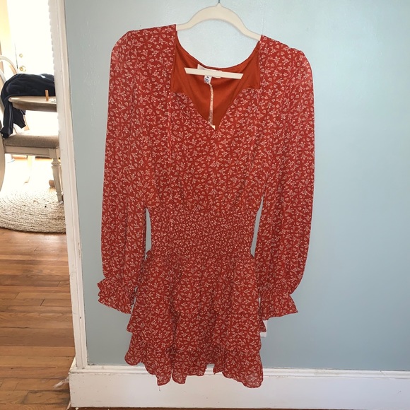 Beautiful red dress with ruffles on the bottom and the end of the sleeves