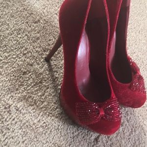Fancy red high heels with rhinestone bow in the front and red velvet texture pump