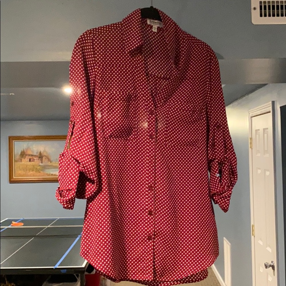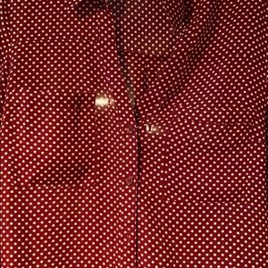 Red button down with white pokadots and two pockets