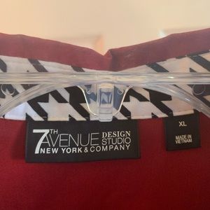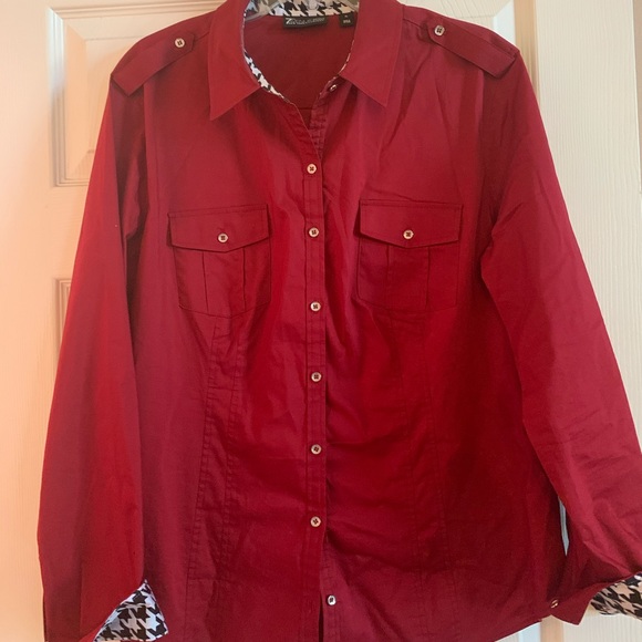 Red button down blouse with epaulettes and contracting herringbone cuffs and collar.