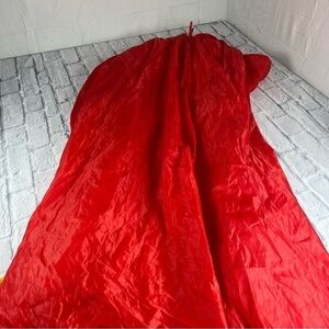 This is a double fabric red cape with hood. The exterior is a red polyester and the interior is a mesh net lining. This ties on. Photos also contain measurements. Discussed her my smoke free home and is in gently preowned condition