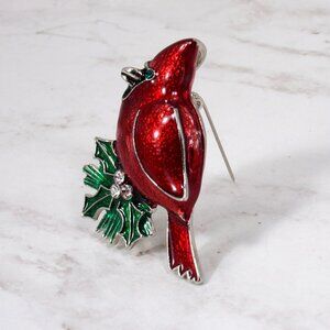 Beautiful red cardinal pin with green leaves and crystals. It is created with red enamel, green enamel and clear crystals. It has a green crystal in the eye. A beautiful red accent piece on any sweater, hat, bag, or scarf. New and never worn.