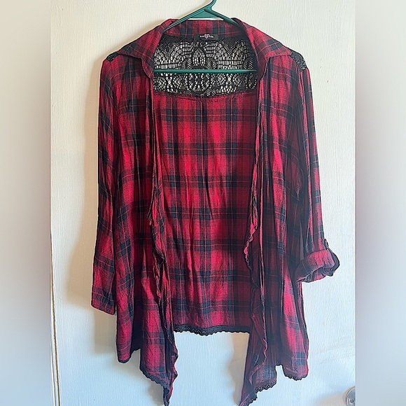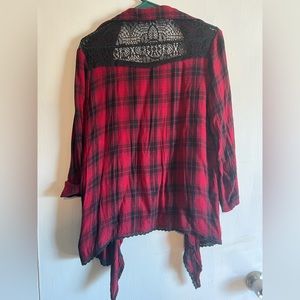 Very nice with lace detail on upper back. Beautiful red checkered detail with 3/4 length sleeves with option to button up higher on the arm. Size Medium.