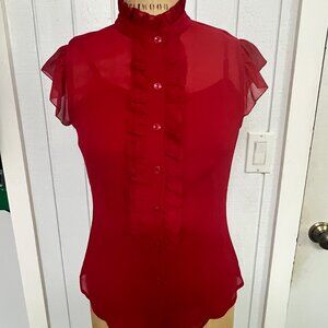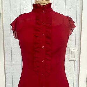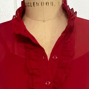 Red chiffon ruffled tuxedo top, short capped ruffled sleeve, supercute blouse, dress up or dress down with jeans, tag says medium but fits more like a Small. I take all offers within reason and free shipping on lightweight items like this top : )