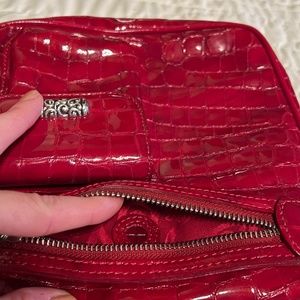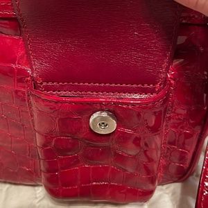 Brighton Vintage Red Crocodile Patent Leather Crossbody with Silver Color Accents, Adjustable straps, Front cell phone pocket (small) Front zipper pouch, additional zipper pocket and credit card slots, Side compartment, Back zipper pouch. Leather strap with heart fob