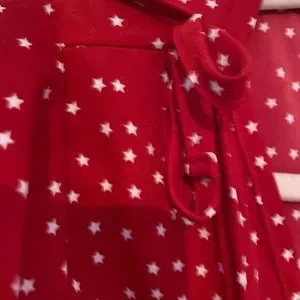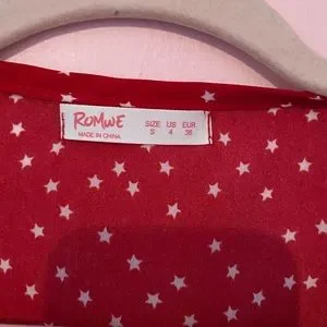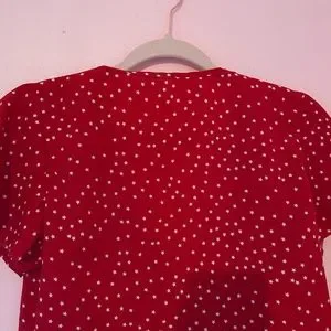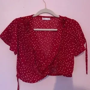 Wore only for photos about two times. You have to cross it over and tie it, it’s super comfy. It is cropped, and has a cute print to it.
