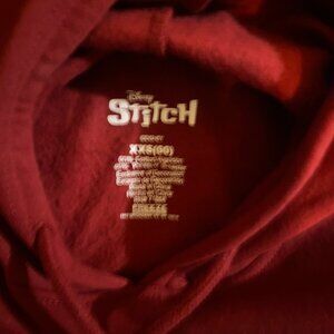 It is a redish maroon color. It has a stitch embroidered into the front of the hoodie, but the rest of the pictures are just plastic. It is an extra extra small. The strings are still in tact and it has basically never been worn.