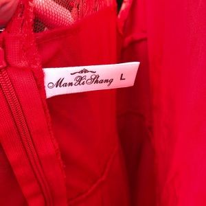 Never worn. Red, lace dress. Buttons in the back, key hole. Hits at the knee. Fits like medium.