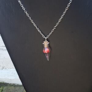 Beautiful clear bulb holds a miniature red flower. A cork stopper holds it closed and attaches to the silver chain. Beautiful gift!