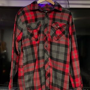 Red medium sized flannel, it’s used, no flaws, true to size.