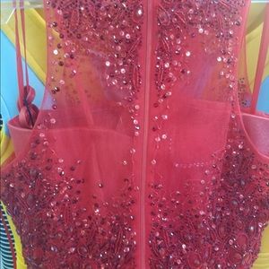 A beautiful unique red dress perfect for any occasion. The red dress comes with a gorgeous detailed piece that can be removed if desired.