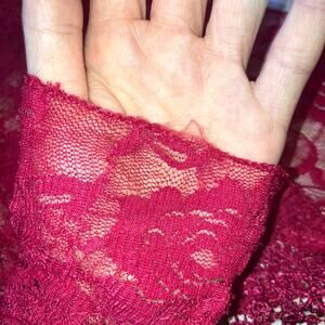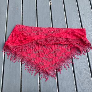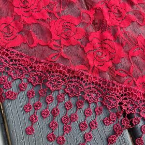 Sheer red floral mesh tassel fringe scarf / shawl. Measures 61" by 20.75" at longest points. Bohemian, fairycore, romantic, whimsigoth, Y2K, 90s, boho chic. Excellent condition pre owned. Stitch on hem is just starting to unravel on one tiny spot as shown in last photo.