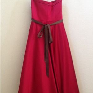 A lovely, silky smooth strapless tea length gown in red. Built in bra cups provide support. Shown with a chocolate brown ribbon around the waist. Pristine condition, only work once. Great for weddings, holiday parties, or formal dances.