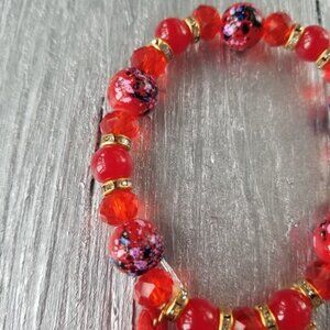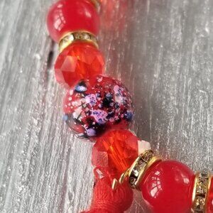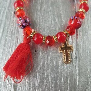 This bracelet is made of all glass beads, Including a gold band bead with rhinestones inside. It has a tassel and gold cross attached to it. 5 beads have pink, blue, and black paint splattered on them.