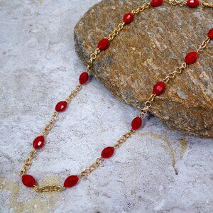 Radiant and refined, this red glass necklace and earring set captures the essence of timeless elegance. Designed with oval, facet-cut red glass beads, each glimmering with light, the necklace is delicately spaced with a gold-plated round link chain that adds a touch of luxurious shine. The matching earrings echo the design in perfect harmony, completing the set with graceful balance.