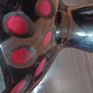 Red glass pedestal fruit bowl, approx 11" dia, 7" tall, etched ovals