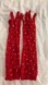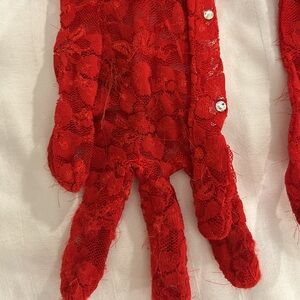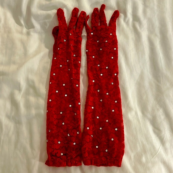 Red lace gloves with rhinestones I glued on . Worn for feature dancing g and burlesque shows. A bit of wear on palms but stillll in good condition.