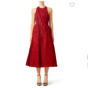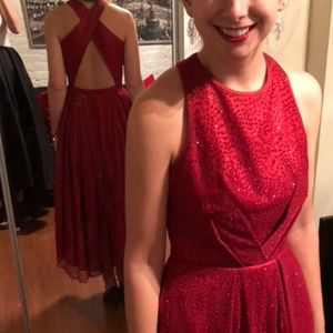 Beautiful red tea length gown with fun back and some sparkles! I bought this as a holiday dress and felt like a princess at my party.