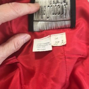 Fitted red gown (wearer was 5’1”). Front slit but not opened and obvious with tulip hemline in front. Open to rosette in front. Travels well, doesn’t wrinkle.