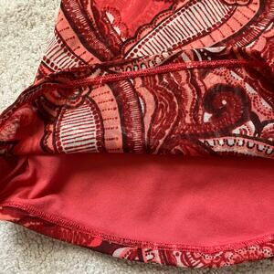 Red groovy paisley print semi sheer mesh V neck blouse with 3/4 sleeves and gathering on front torso, bohemian Y2K hippie fairycore style. Front of torso/chest is lined but sleeves are not, nor is back of shirt (though it does have a double mesh layer). INC International Concepts. Size small, pit to pit 14", pit to hem 14.5". Excellent condition pre owned.