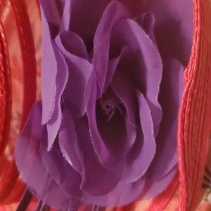 Great shape! 50% polyester & 50% polypropylene red hat with purple rose and purple ribbon