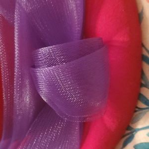 Like New! 100% wool hat with purple plastic like ribbon and huge bow in the back.